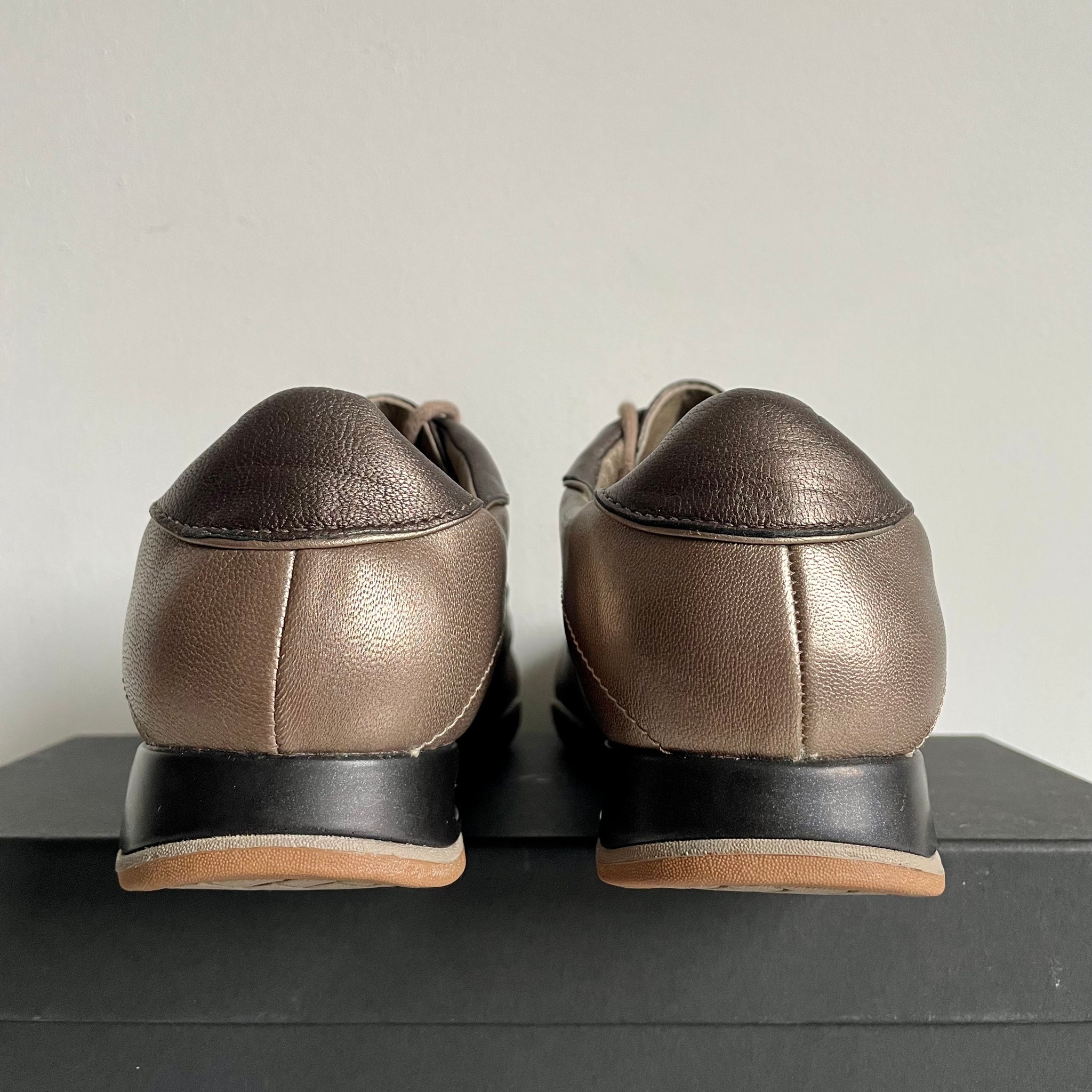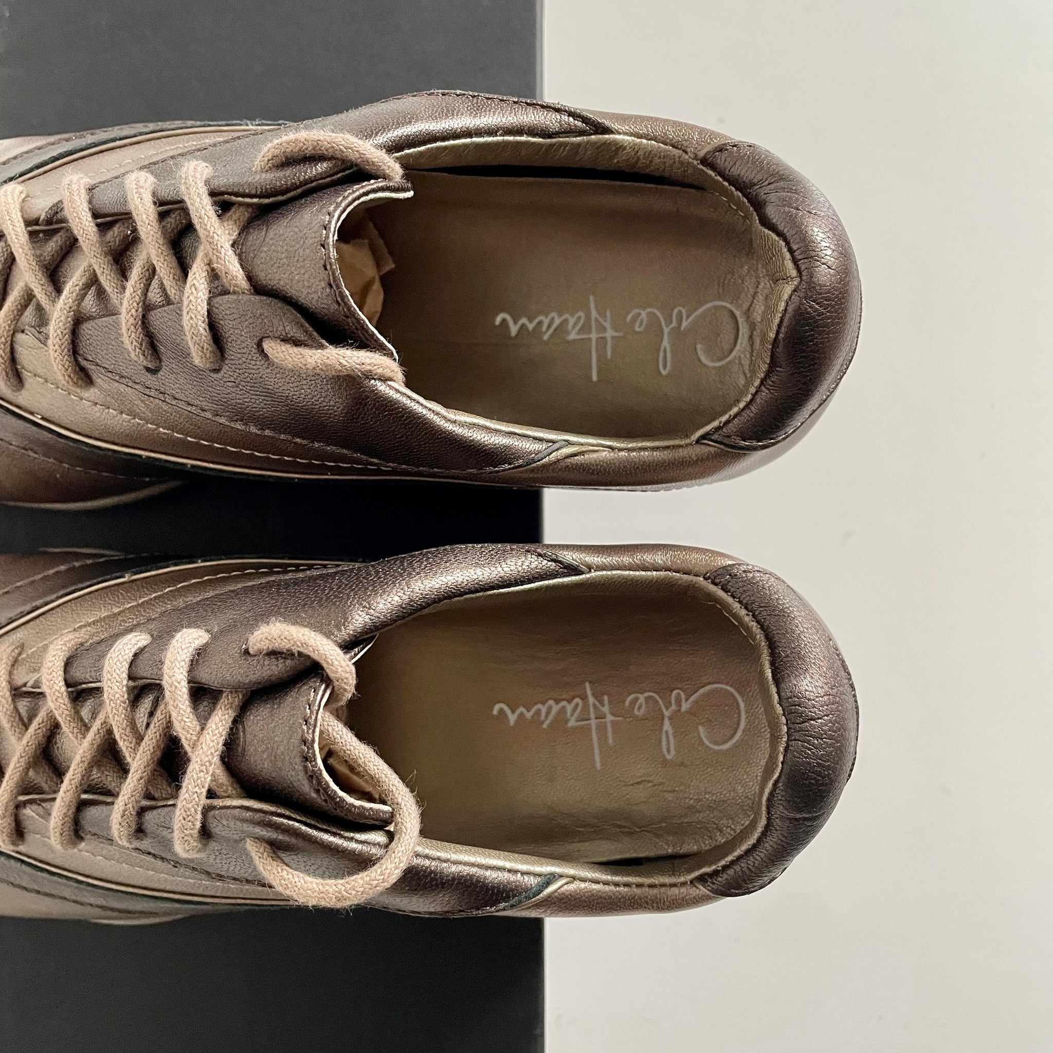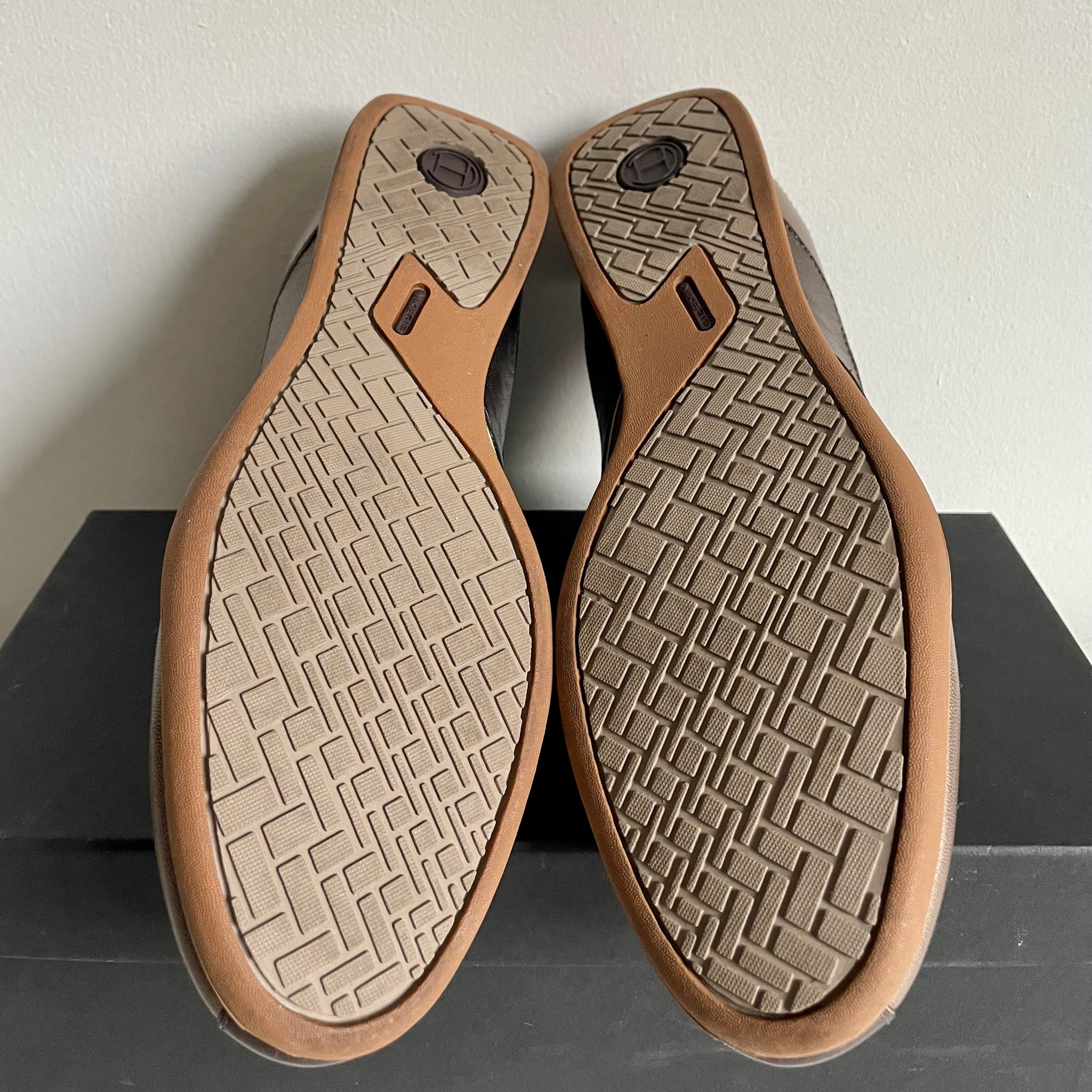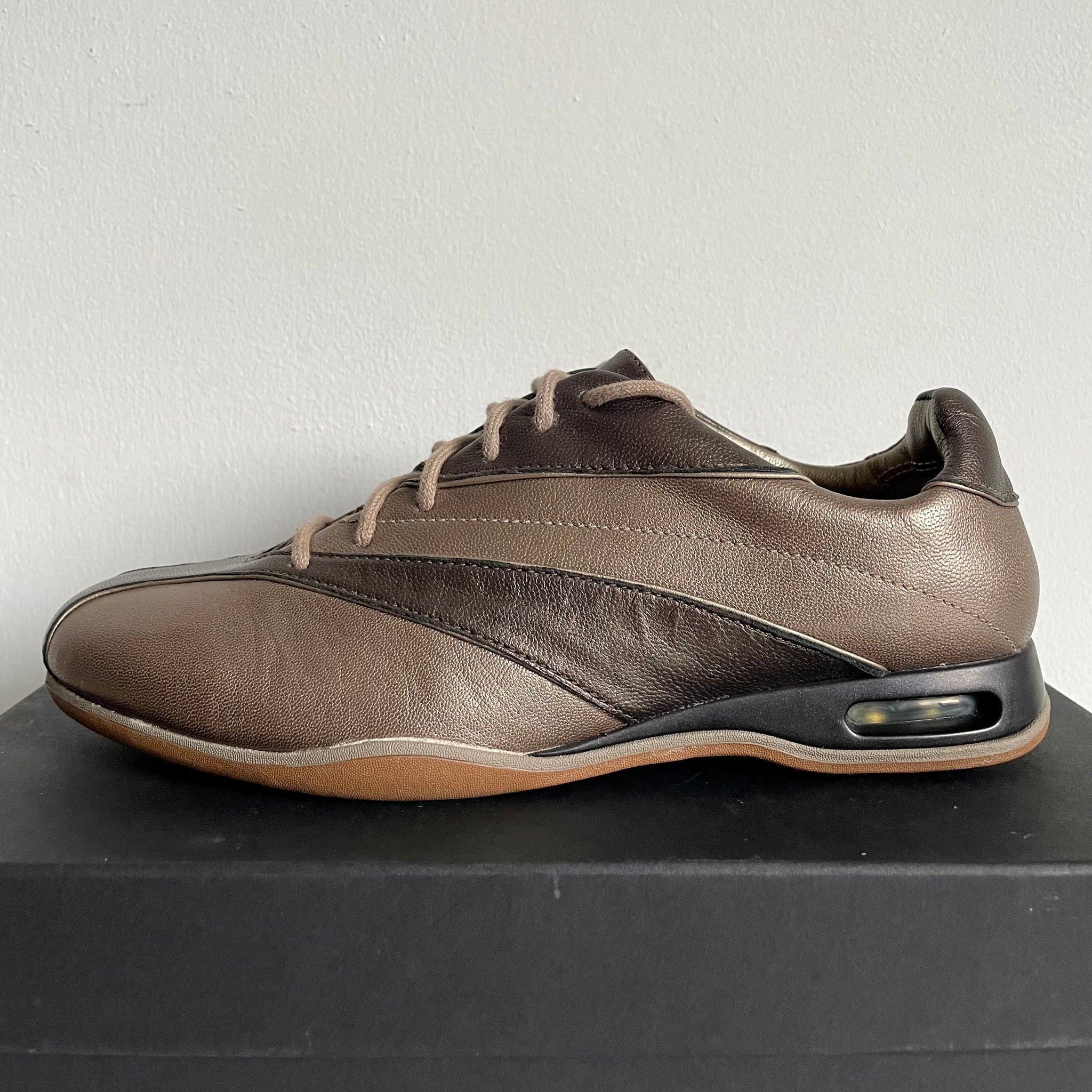 Soft metallic leather, fluid paneling, and a mini Nike Air heel define the Cole Haan Air Brianna—a polished, low-profile hybrid that blurred the line between sport and dress. Despite its release under the Cole Haan name, the model retains “Air” in its title, a quiet nod to the Nike cushioning technology embedded within. The elegant design favors restraint, with branding kept deliberately minimal, characteristic of many Cole Haan / Nike crossovers from the post–G Series era. A discreet emblem appears on the tongue and is echoed on the outsole, where the same mark sits alongside a Nike Air logo.