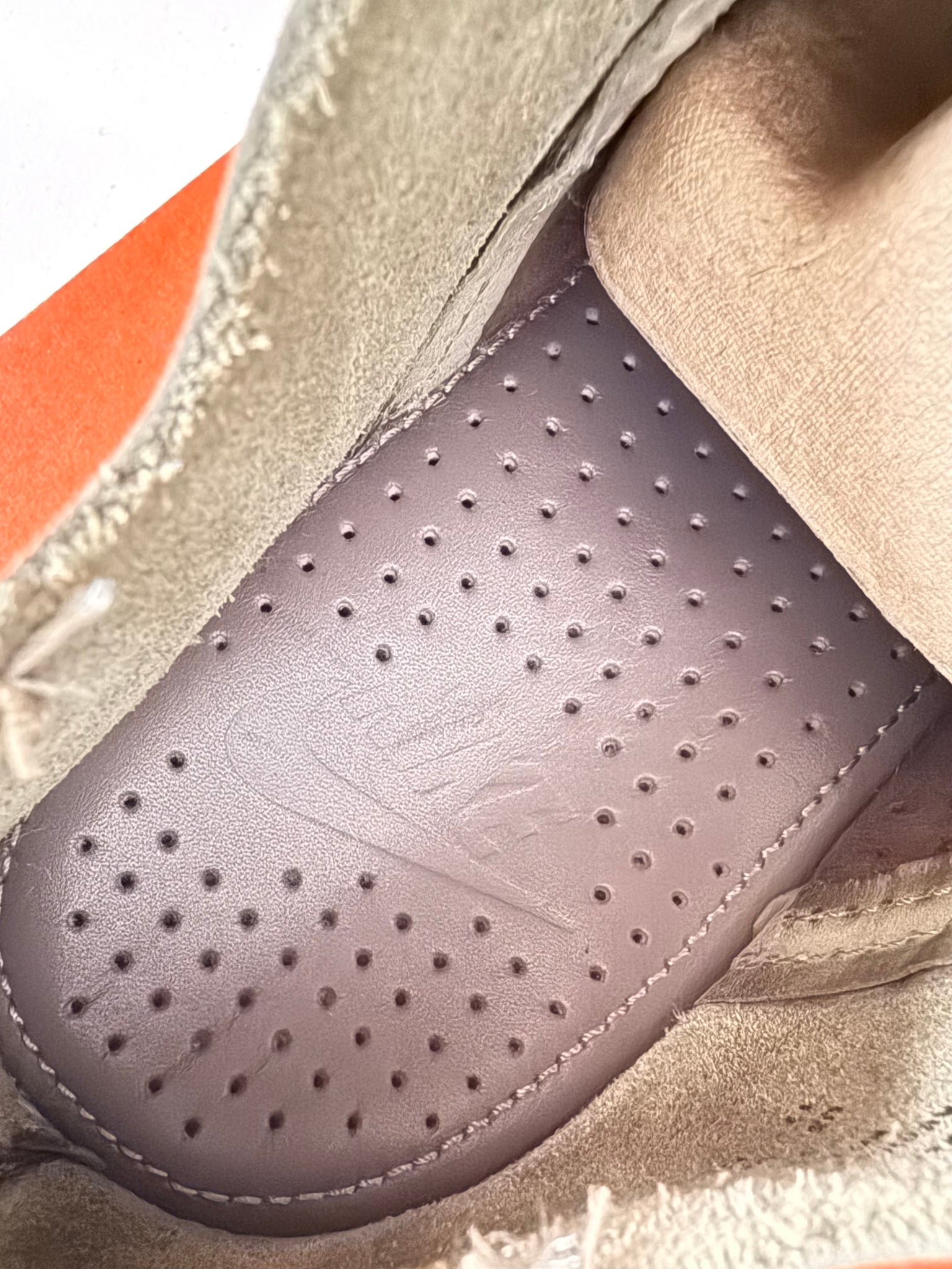 The BB low employs an inside-out construction, exposing the seams on the exterior, with the upper stitched into a single-piece molded sole unit. The outsole was designed to lock together, using water-based cements eliminating the need for toxic solvent-based adhesives. Environmentally preferred rubber was used in parts of the outsole, incorporating Nike Grind material – scavenged from leftover factory scraps. The primary material on the upper is a vegetable tanned leather sourced from tanneries that recycle wastewater to minimize environmental toxins. Like other early Considered models, the BB uses hemp laces with leather anglets in place of the usual plastic lace tips. The heel features a braided seam — a design element also found on the Chukka Boot, Mule, Mowabb, and CVT.